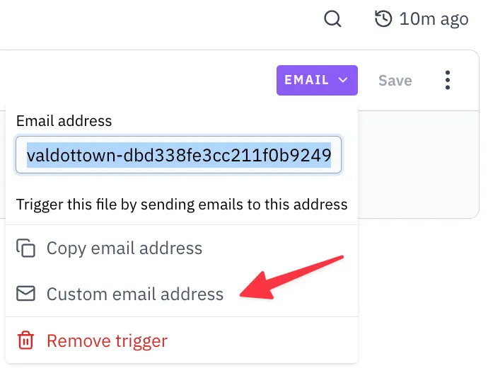 Similar to HTTP endpoints, you can set a custom email address by clicking on the Email trigger and selecting Custom email address.